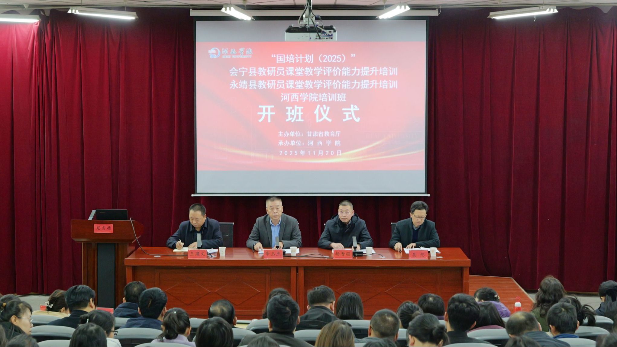 11月20日,由甘肃省教育厅主办,河西学院承办的“国培计划(2025)”县域教师发展整县提升培训项目—会宁县、永靖县教研员课堂教学评价能力提升培训举行开班仪式。会宁县教育局教研室杨晋强、永靖县教育局教研室吴彤、继续教育学院负责人、项目首席专家、班主任、培训学员共110人参加。